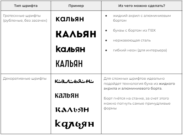 Сравнительная таблица шрифтов и описание технологий изготовления