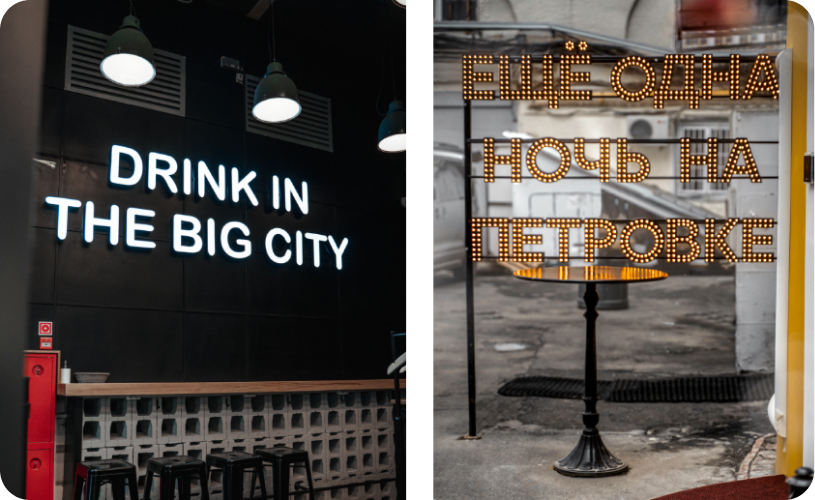 Интерьер ресторана не менее важен, чем кухня и обслуживание. Вы можете организовать красивые тематические уголки внутри помещения используя световые конструкции. Тем самым вы простимулируете многих людей к тому, чтобы они фотографировались и выкладывали фото в социальные сети с отметкой адреса вашего заведения. Это поможет набрать популярность и запустить сарафанное радио.