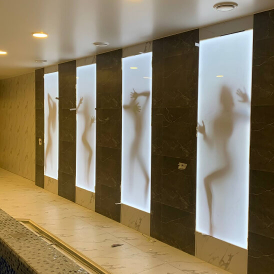 Сделана из композитных панелей и молочного оргстекла 10мм. Во фрезерованные отверстия в композите вставляются световые инкрустированные элементы.
